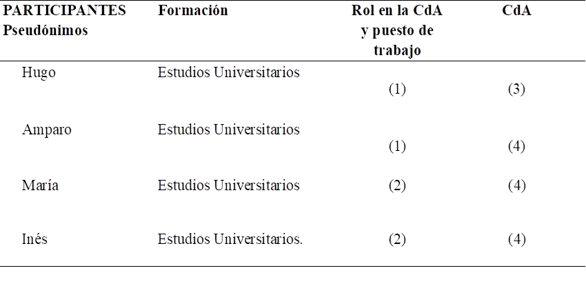 Este estudio cuenta con las voces de seis personas que pertenecen a dos CdA (CdA1 y CdA2) situadas en barrios periféricos marcados por la desigualdad y la exclusión social: dos relatos comunicativos de mujeres gitanas (RC) que han trabajado en una CdA en puestos de apoyo educativo, junto con las entrevistas de dos miembros del equipo docente y dos del equipo directivo de las respectivas CdA. A la totalidad de participantes se les informó de los objetivos de la investigación y de la anonimidad de los datos extraídos a través de los consentimientos informados.